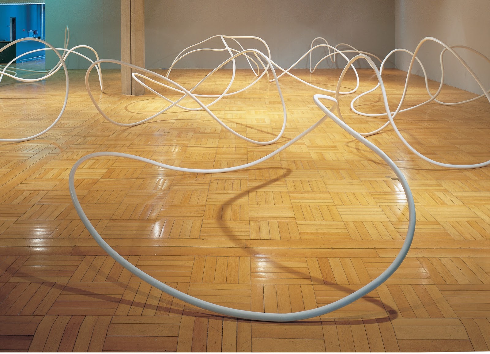 Para a empreitada, sete artistas nacionais foram selecionados a expor suas instalações em diferentes ambientes. Os arcos de Tomie Ohtake, mencionados acima, dividem espaço com Espera, de Leandro Lima e Gisela Motta, no piso térreo. Ali, a videoinstalação usa dois bancos para projetar as sombras de um casal que nunca estará junto, mas que vive a expectativa do encontro. O rito se repete: ora é a sombra dele que vem, senta-se, espera, levanta e vai embora; ora é a dela que repete o mesmo percurso físico-afetivo. Evocativas, as sombras são verdadeiras presenças de uma ausência. Entre as inúmeras referências e camadas interpretativas, fazem lembrar um dos mitos ocidentais da origem do desenho, em que uma jovem apaixonada risca na parede o contorno da sombra projetada do amado que se preparava para ir à guerra. Os mesmos bancos também convidam o público a se sentar e contemplar a obra “de dentro”.